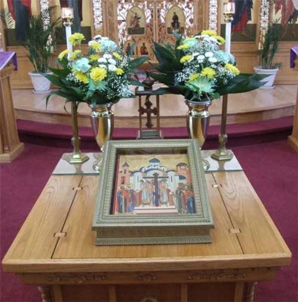 In the center of the church, you will see a small table upon which is placed the icon, remembered on this particular day of the year, or alternately, the icon of the saint or feast to which the particular church is dedicated. In our church, you will most often, see the icon of the Holy Cross to which our community is consecrated. It is to this central image that upon entering the church, the faithful will come to venerate.